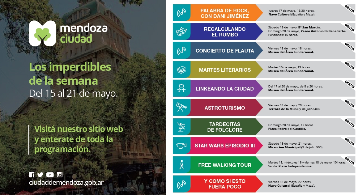 Palabra de Rock, con Dani Jiménez: jueves 17 de mayo, 19.30 horas. Nave Cultural (España y Maza). Artista invitado: Pity Fernández (Pastillas Del Abuelo). El periodista y el músico intercambiarán ideas e intentarán transmitir y desentrañar la experiencia desarrollada en sus profesiones. Inscripción en www.ciudaddemendoza.gov.ar. Gratis.