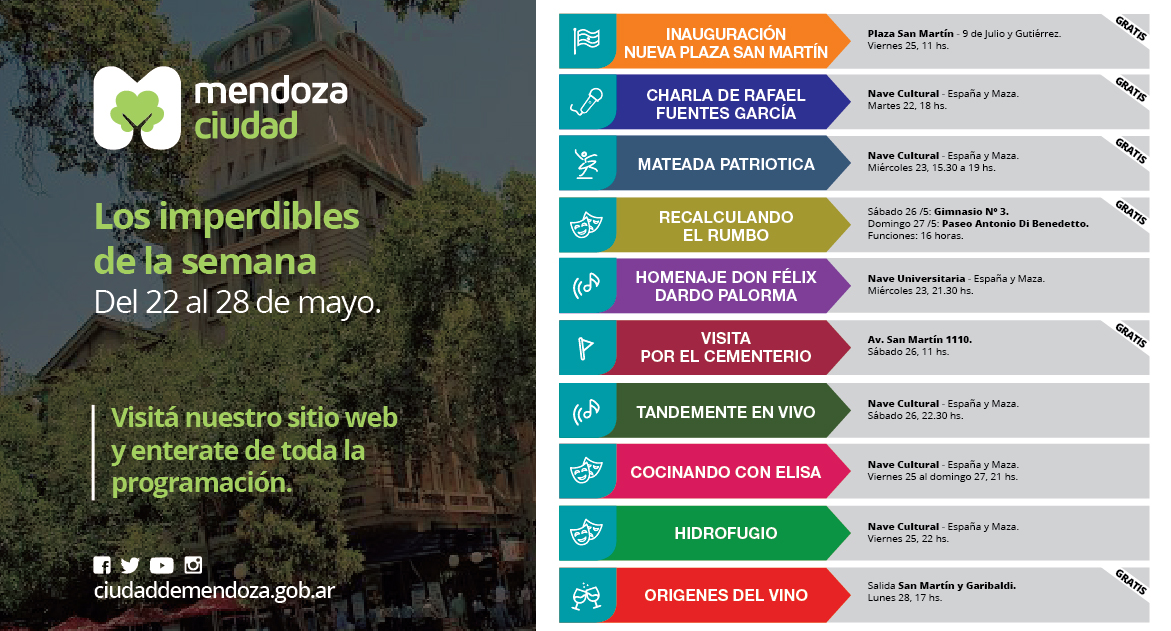INAUGURACIÓN NUEVA PLAZA SAN MARTÍN. Gratis. Plaza San Martín – 9 de julio y Gutiérrez. Viernes 25, 11 hs. Éste viernes te invitamos a participar de la ceremonia de corte de cinta y al acto oficial del 25 de Mayo. La fiesta continuará hasta el domingo 27. Habrá patios de comida con platos típicos, espectáculos en vivo, conciertos exclusivos y mucho más. Programación en www.ciudaddemendoza.gov.ar