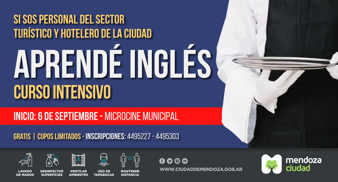 El municipio anuncia la apertura de las inscripciones a un curso de inglés intensivo para personal del sector turístico-hotelero de Mendoza. La capacitación será gratuita y con cupos limitados, por lo que se requerirá inscripción previa. El cursado tendrá una duración de tres meses y comenzará el lunes 6 de septiembre.