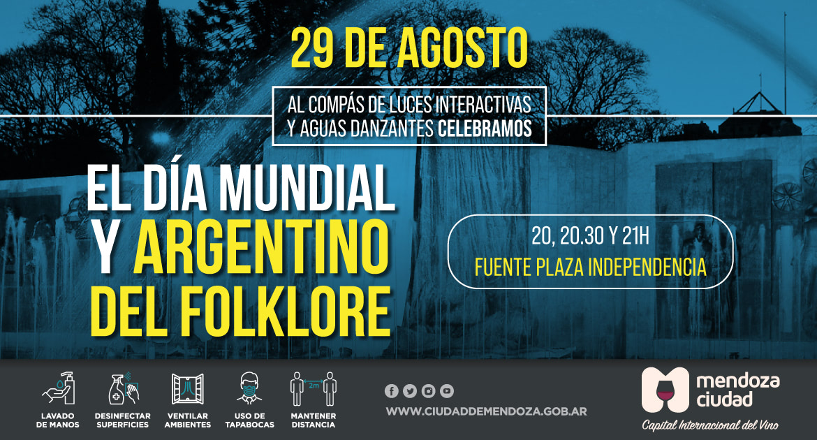 El 22 de agosto es una fecha que rememora, mundial y localmente, la tradición del folclore. Por esto, la Ciudad lo celebrará con un show con la actuación del ballet de la Ciudad de Mendoza, luces interactivas y para el cierre, el espectáculo de aguas danzantes que tendrá lugar en la fuente, recientemente inaugurada, de la plaza mayor.