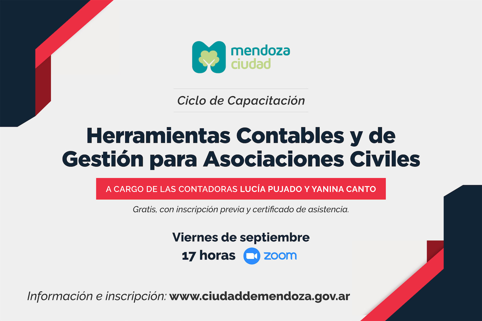 La Municipalidad de la Ciudad de Mendoza invita a su ciclo de charlas virtuales sobre Herramientas Contables y de Gestión, destinado a las Asociaciones Civiles. El mismo comienza el viernes 3 de septiembre a las 17 hs y será para referentes que llevan adelante la función administrativa de aquellas asociaciones inscriptas en el programa “Construyendo Puentes”.